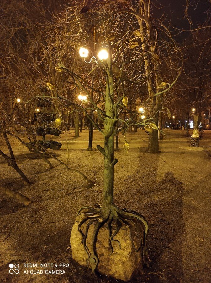 В один из таких условно «мирных» предновогодних декабрьских вечеров ноги занесли нас с супругой в Парк Кованых Фигур, что за резиденцией градоначальника – между улицами Артема и Университетской. И мы побродили здесь. Вдоволь. И пофотографировали волшебные фигуры из металла, оживленные преломленным светом луны и фонарей. Отчего их железные тени плясали в ритме донецких сквозняков вперемешку с тенями деревьев, кустарников и туманных фигур таких же, как и мы бродяг…