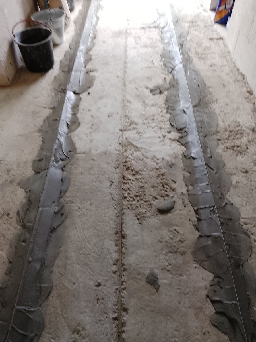Здравствуйте! Продолжаю по немногу освещать что мы делаем, что строим в Крымском селе. Пока никого нет, решил залить стяжку под укладку плитки. Скоро в дом будет заносится мебель, будут работать электрики, оконщики, да и ламинат готов, хочется что бы заносилось меньше мусора. На такой коридор ушло двадцать мешков стяжки, четыре маяка ну и немного грунтовки. Заказчики уже взмолились, когда ж уже кончатся мешки. Да уж говорю, мы у себя строим, жена каждый день возит мешки, то штукатурку, то клей, то стяжку. Ребята, говорит, на базе, уже ждут, если хоть день не приезжала, спрашивают, что случилось, ждали, ждали, да ж на улицу выходили, а вас все нет, тоже юмористы. Вот такую смесь заказчик для пробы привез. Как в Крым просочилась смесь из Тольятти, да еще по цене дешевле чем местная, не понятно. Но в работе хуже, неудобней, решили больше не брать. Мешки кстати сразу не выбрасываю, как не выбрасываю все остатки, обрезки. Это привычка такая, давняя, к вопросу о том что все стро