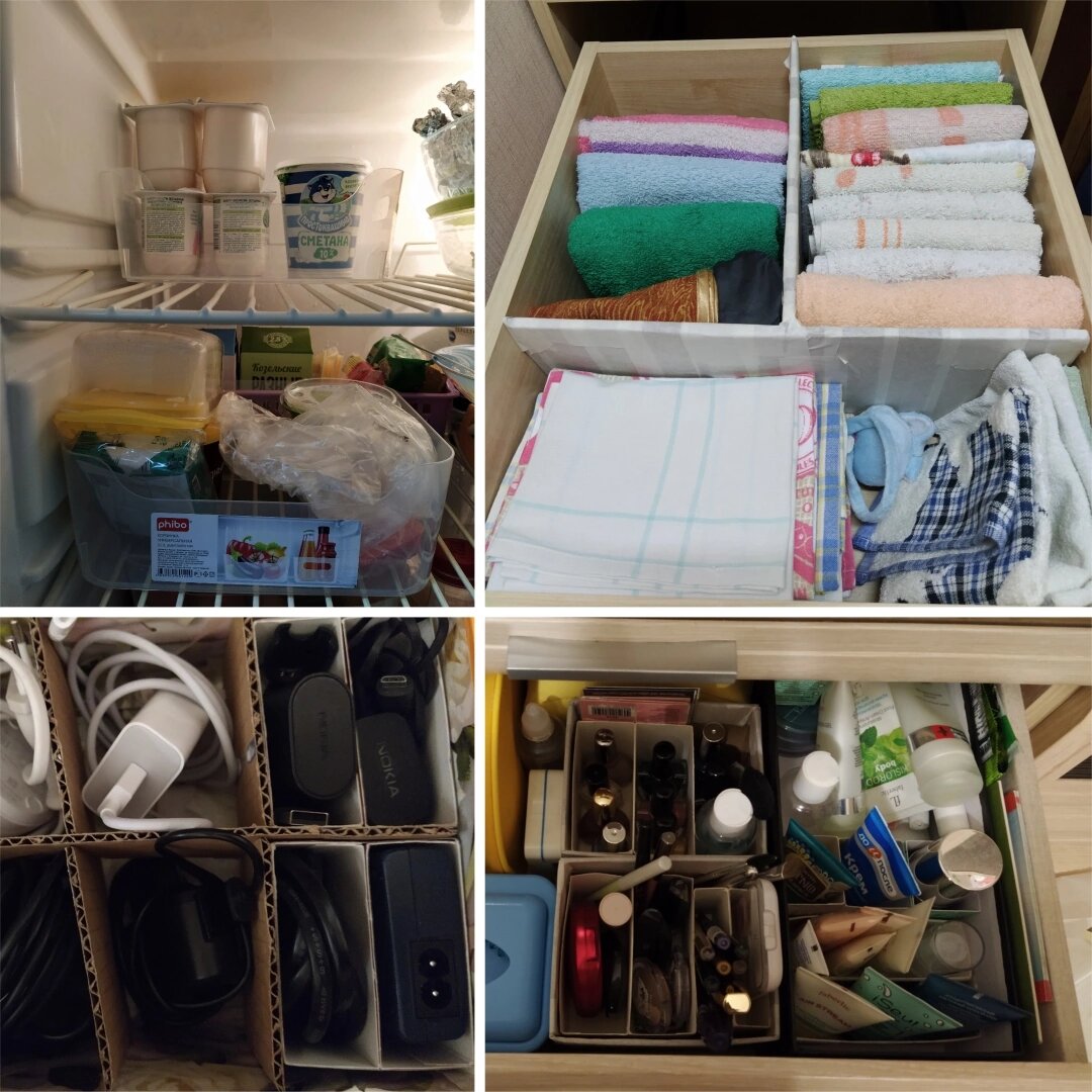 Может просто свободное место на диске подошло к критической отметке и я кинулась разобрать старые фотографии... Но вспомнился мне тот 2020 год, когда мы все дружно сидели по домам и также дружно кинулись разбирать завалы. Так вот в тот год мой ребенок серьезно так заболел, еще до введения карантина, что мне пришлось взять больничный. Когда наступил период выздоровления появилось время на творчество. И тут, как говорится, Остапа понесло... Я и раньше не очень-то могла выбраться в Икею (а жуть как хотелось), а теперь это вообще не представлялось возможным, но творить руками и придумывать что-то из подручных средств я всегда любила. И тогда пошли в ход коробочки от лекарств и обуви, картон и бумажный скотч. Таким образом я упорядочила хранение зарядных устройств, косметики и полотенец. Кстати эта невзрачная конструкция для зарядок прижилась надолго. В холодильнике я впервые попробовала использовать контейнеры - тут результат был 50/50 - размер оказался не удачным. Да, тогда я еще н