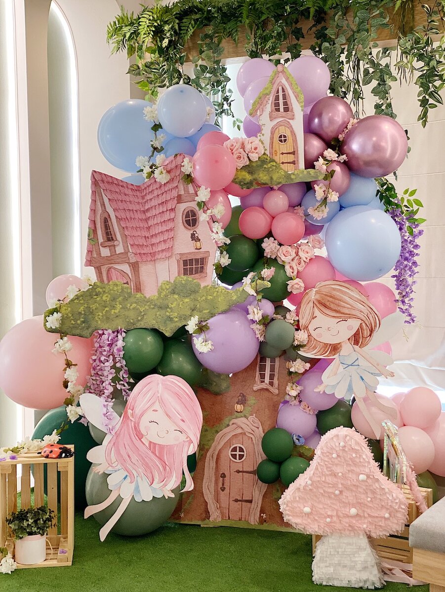 Сегодняшняя статья будет о том, как мы оформляем праздники декором собственного производства! В этом волшебном празднике с феечками всё детальки были сделаны вручную! Во-первых, чудесные рисованные домики, которые мы распечатали на плотном картоне и вырезали. Во-вторых, композиция, которую мы собрали из рисунков и шаров! Вместе получилось волшебное дерево, окружённое феечками. Рядом на мольберте мы разместили дизайнерский плакат достижений, посвящённый маленькой имениннице. Вокруг расставили деревянные ящики, разложили цветы и божьих коровок. Огромных божьих коровок! Да, а ещё несколько красивейших грибочков ручной работы — каждый в своём стиле. Если вы хотите необычную фотозону на своём празднике — вы знаете, к кому обратиться 🙂