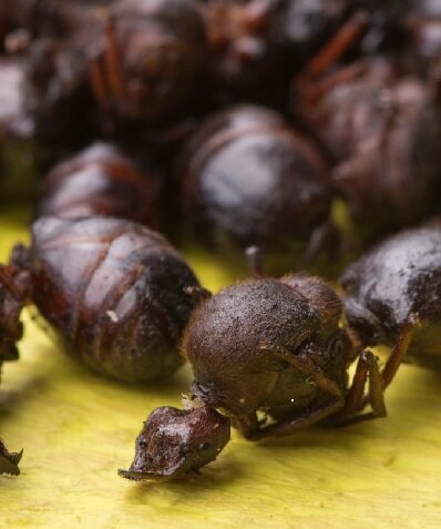 Хормигас кулонас - крупные муравьи-листорезы, которые являются популярным деликатесом в Сантандере, Колумбия. Эти съедобные насекомые обычно женского пола и собирают их весной. Готовят их обжаривая с солью, а затем подают в небольших контейнерах или пакетиках в качестве закуски. Вид называется Atta Laevigata, а по-испански hormigas culonas означает "муравей с плоской задницей". Это одни из крупнейших муравьев и являются хорошим источником белка с низким содержанием насыщенных жиров. Муравьев собирают в сезон дождей в апреле и мае в течение всего нескольких недель в году. Этот вид часто встречается в Колумбии, а если более конкретно то в регионе Сантандер. Они продаются на улице в жареном виде и стоят недешево. Местные колумбийцы употребляют в пищу этих муравьев в течение сотен лет, соблюдая традицию, унаследованную от доколумбийских культур. В качестве закуски их часто продают на углах улиц, поджаривают с солью или готовят с добавлением вина. В некоторых высококлассных ресторанах из