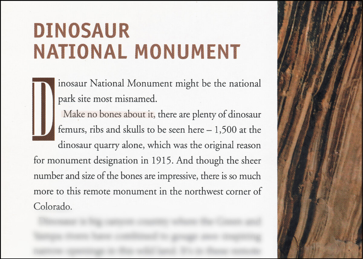 О том, что в английском языке – как и в любом другом, кстати – есть множество устойчивых выражений, мы и так все знаем. Конечно, сами англоговорящие люди свои идиомы знают и умеют использовать, где нужно. А иногда, особенно нам пришлось читать рекламный пост, обзор, статью в журнале, могут встретиться идиомы не простые, а ещё и обыгранные в контексте. И хорошо бы нам всё это ещё и понять с первого раза 😄 Вот как американские журналисты шутят Посмотрите, что нашлось в журнале, посвященном природным красотам штата Колорадо: Речь, собственно, о национальном парке, на территории которого встречаются окаменевшие кости динозавров. Даже названия костей перечислены поимённо, а, кстати, вот и лексика: Но что же имел в виду автор, когда предлагал нам не делать "из всего этого костей " ? Почему он сначала говорит, что костей делать НЕ НУЖНО, а потом их же и перечисляет ? Почему вообще костей не нужно там, где их целые тысячи ? Всё просто – да это же очередная английская идиома ! Очевидно, что ту