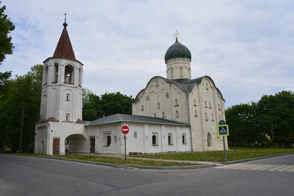 Каменная церковь Федора Стратилата на Ручью – ул. Федоровский Ручей, д. 19/2. Одна из самых впечатляющих построек Новгородской феодальной республики периода расцвета. Она воздвигнута в 1360-61 гг. по заказу боярина Семена Андреевича и его матери Натальи. Этот храм получил имя Федора-военачальника, Федора Стратилата. Впрочем, когда церковь была построена, был и ручей, и улица называлась по-другому, от туда и произошло название «на Ручью». Предположительно, на этом месте был храма Федора Тирона, 1115г, сгоревший в в 1329 году. Церковь Федора Стратилата на Ручью - это первый храм нового типа, итог всей предшествующей архитектуры, который стал каноном для дальнейшего новгородского строительства. Постройка одноглавая, квадратная в плане, с одной апсидой и трехлопастным завершением фасадов. Фасады имеют трехчастное членение лопатками, завершающимися ползучими многолопастными арками. Украшение стен - накладные рельефные кресты из кирпича и закладные, вытесанные из цельного камня. С западн