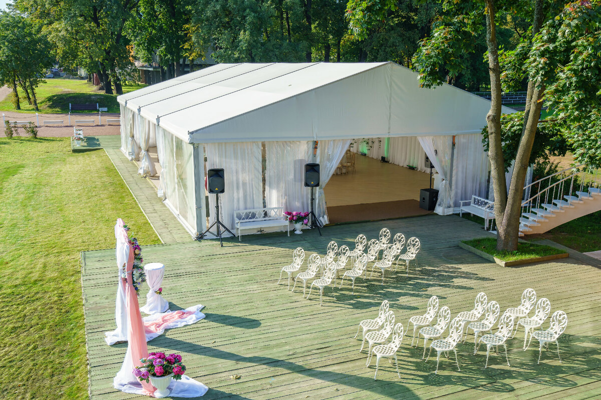 Свадьба в шатре на природе — актуальный тренд горячего свадебного сезона благодаря тому, что позволяет свадебному банкету не ограничиваться площадью традиционного банкетного зала, а имеет возможность выйти на природный простор в прямом смысле этого слова. Поисковый портал 4banket.ru рассказывает об особенностях свадьбы в шатре. Плюсы организации свадебного банкета в шатре: При выборе шатра, обязательно обратите внимание на его конструкцию. Шатры бывают открытые и закрытые, летние и всесезонные. Открытый летний шатёр представляет из себя тент на опорах без нескольких боковых стен или полностью без стен. Такая конструкция подходит в качестве укрытия от солнца для проведения выездной церемонии или банкета в сухую безветренную погоду. Закрытый летний шатёр образует замкнутое пространство с защитой от солнца, ветра и дождя. Всесезонный шатёр обладает дополнительной защитой от погодных факторов и оснащён климатическим оборудование, создающим комфортную температуру внутри: зимой — тепло, а ле