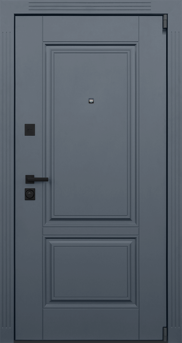 Внешняя отделка: Наружный лист металла 2 мм. Панель МДФ 16 мм. Объемная фрезеровка. Цвет "Графит". Наличник МДФ толщина 16 мм, ширина 85 мм;