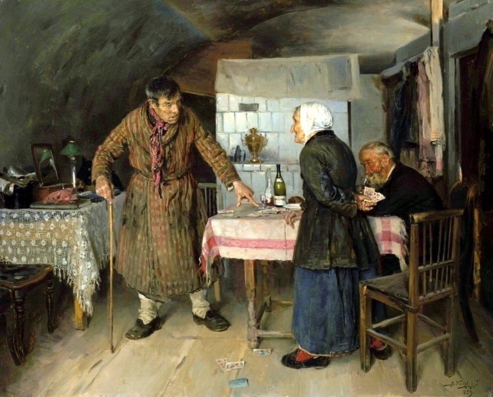 Под низкими потемневшими сводами полуподвала собралось небольшое общество. Трое квартирантов затеяли картёжную игру на деньги, но что-то пошло не по плану. Впервые «Ссора из-за карт» Владимира Маковского предстала перед публикой в 1889-м году. Картина произвела большое впечатление на Павла Третьякова и без промедления была куплена меценатом. Помимо игральной колоды видны пустые тарелки и бутылки со спиртным. По мере увеличения объёма выпитого накаляются и страсти за столом. Мужчина в засаленном полосатом халате подозревает, что его партнёрша по партии жульничает. В возмущении он вскакивает, тяжело опираясь на трость, и требует, чтобы женщина предъявила свои карты. Однако угрозы и гневный взгляд визави нимало не смущают старушку. Картёжница со стажем лишь ухмыляется и не намерена признаваться в обмане. В её хищном профиле ни тени страха, только изворотливость и желание поскорее сорвать куш. Седой старик, примостившийся сбоку, молча наблюдает за происходящим. Он не вовлечё