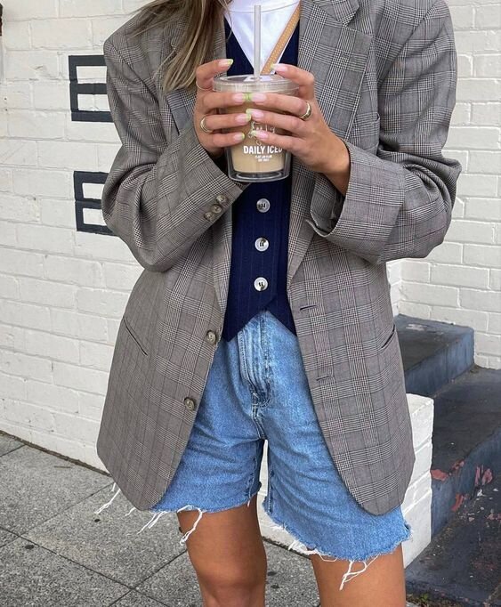 Летом привычные и всем любимые джинсы легко заменяются девушками на джинсовые шорты. В последнее время наиболее актуальными считаются свободные, не облегающие ноги фасоны, мини или удлиненные до колен. Могут быть с ровным срезом и необработанными краями. Обычно девушки шорты носят в основном повседневно на прогулки и отдых, а их можно использовать более функционально. И я покажу как :) С футболкой и топом шорты смотрятся очень органично, однако в этих случаях рекомендую добавлять больше различных аксессуаров: очки, украшения, сумки, платки, ремни, часы и т.п. Для создания многослойности хорошо подходит жакет, он образ делает более собранным и интересным. Главное, чтобы он был свободного кроя (прямой или оверсайз). Длина может быть чуть выше шорт, по шорты или даже ниже. Носим с кроссовками, казаками или кедами. Заменив кроссовки на туфли, босоножки или мюли образ становится более вечерним. Можно также заменить футболку на рубашку или создать многослойность топ+рубашка и рубашка+жакет.