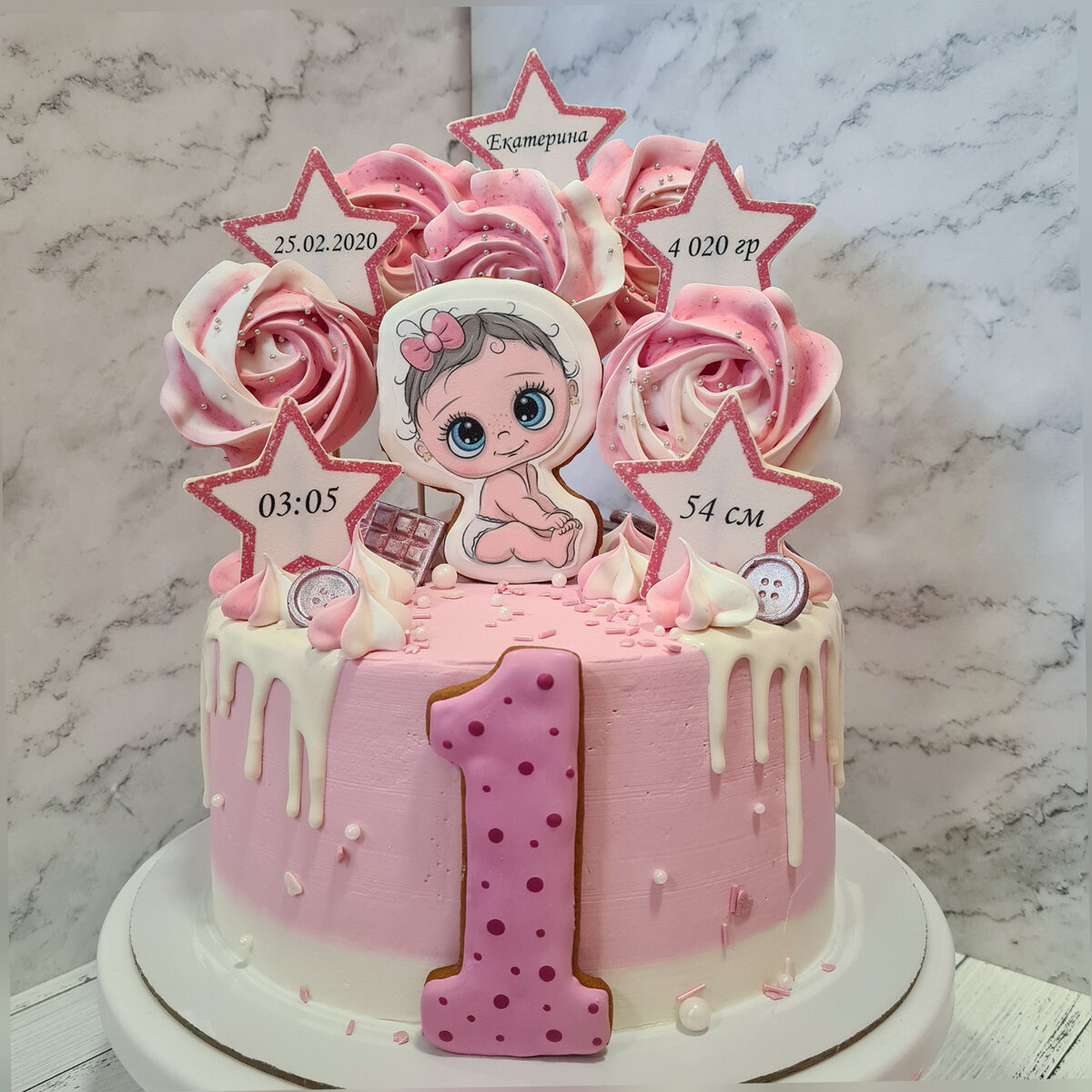 Звезды как всегда сделаны на сахарной бумаге, закреплены на шоколад. Малышка тоже напечатана на сахарной бумаге, а закреплена на прянике. Пряник покрыт айсингом, и с помощью декор-геля (нейтрального геля) картинка приклеена на пряник. Цифра 1 - это пряник. Также покрыт айсингом. Если у Вас есть вопросы - пишите в комментариях. Постараюсь ответить на все) А также если Вам понравился тортик, буду рада увидеть Ваш лайк и/или прочитать об этом в комментариях🥰