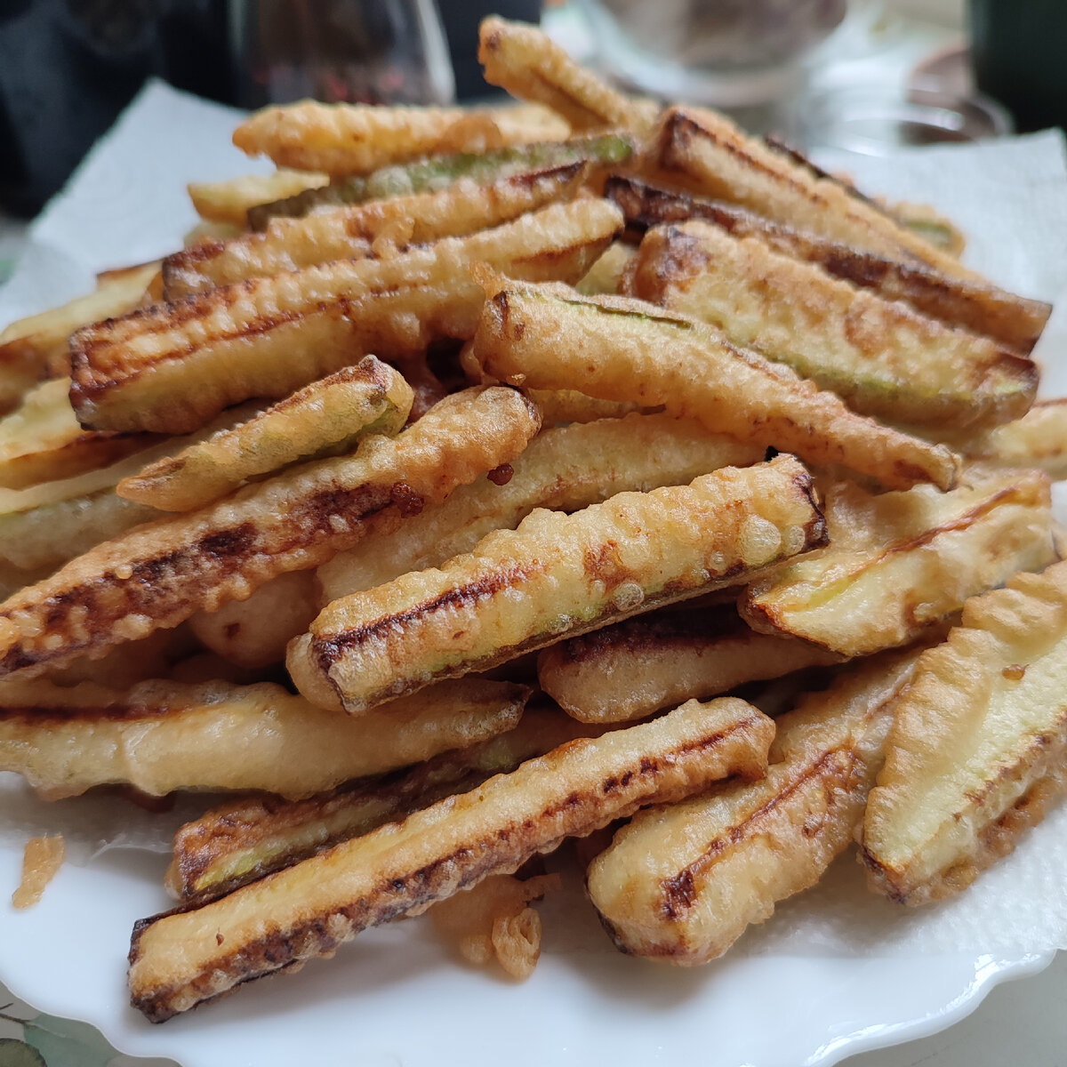 Очень вкусные кабачки получаются, рецепт конечно не назовешь простым, но он точно стоит ваших усилий! Мы снимали выпуск с этим рецептом для программы " Доброе утро" на первом, к этим кабачкам я готовила соус из запечённого болгарского перца, но поскольку это вполне себе самостоятельный соус, который вкусен не только с кабачками, но и с шашлыком, макаронами, в виде намазки на свежий хлеб - я решила опубликовать его в отдельной статье. Ингредиенты: Приготовление: Кабачки помыть и нарезать брусочками, толщиной примерно один сантиметр, не больше, а по длине, они должны быть как картошка фри. Посолить и на дуршлаг, чтоб стекла лишняя жидкость (поставьте дуршлаг на миску или тарелку). Затем выложить в один слой на бумажное полотенце, оторвать ещё бумажное полотенце и промокнуть сверху. Кабачки у меня были молоденькие, поэтому кожуру я не очищала и не вырезала семена. Отделить белок от желтка и взбить в пену. Смешать муку с газированной водой, добавить взбитый белок и аккуратно перем