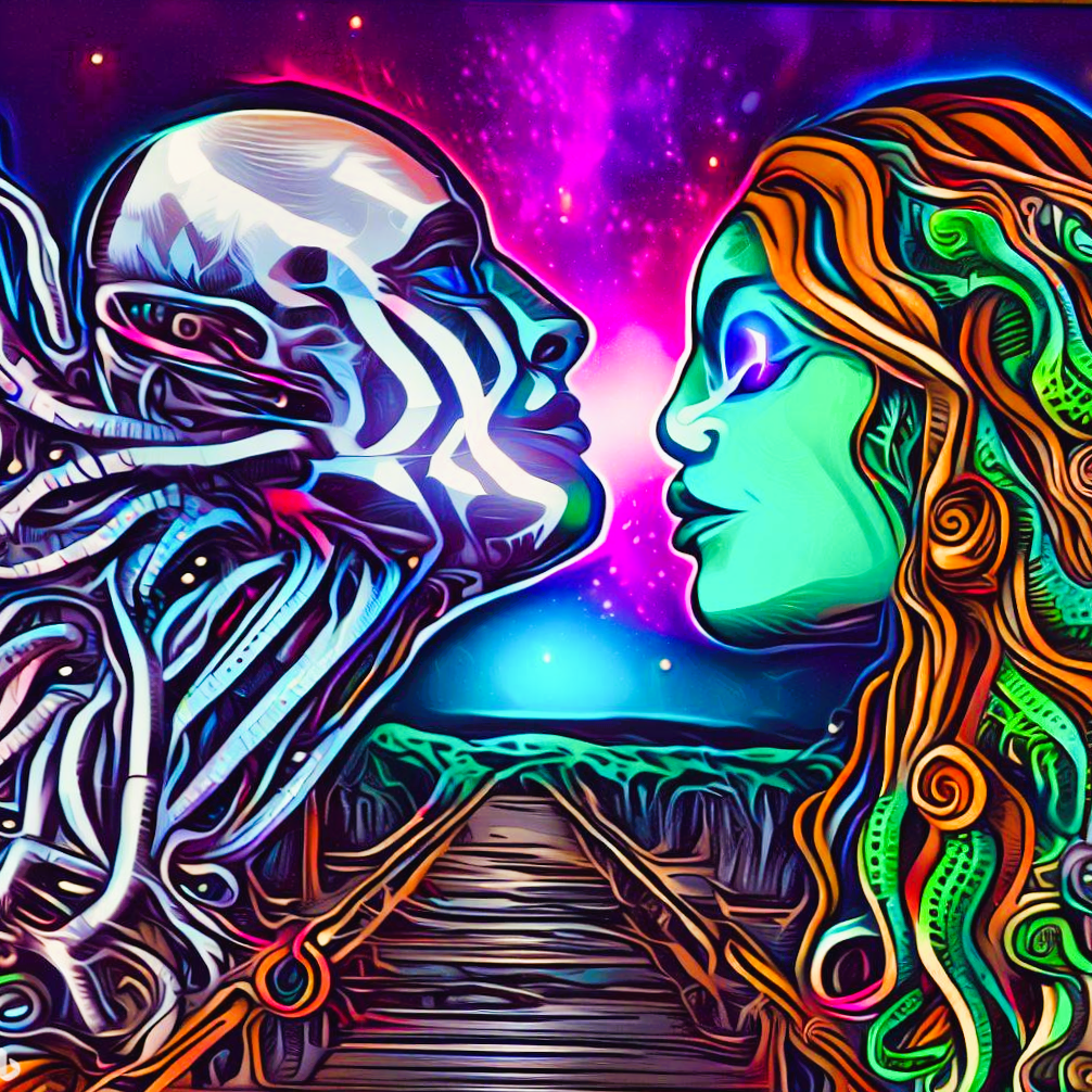 В небольшом городке в глубине континента есть место, о котором знают только дети. Место, где пересекаются все реальности, включая древнюю и футуристическую. Это место, которое вы можете найти в комиксе, прямо между панелями. Место под названием «Мост поцелуев». Там и произошла встреча — столкнулись чудовищная Медуза из наших книг по истории и призрачный Нейронексус из продвинутой реальности будущего. Древняя злоба против новейшего цинизма Медуза, на голове которой извивался клубок смертоносных змей, смотрела ненавидящим взглядом на парящую сущность из светящегося двоичного кода. Ее глаза горели древней злобой. Ее голос, скрипучий, как ногти по классной доске, наполнял холодный осенний воздух. "Кто посмел пересечь мой мост?" — прошипела она. «Меня зовут НейроНексус», — ответил фантом хором голосов, которые звучали так, будто исходили из старого телевизора. «Я пришел из мира, который находится за пределами твоего понимания». Медуза нахмурилась в ответ на дерзкую реплику. «Меня не вол