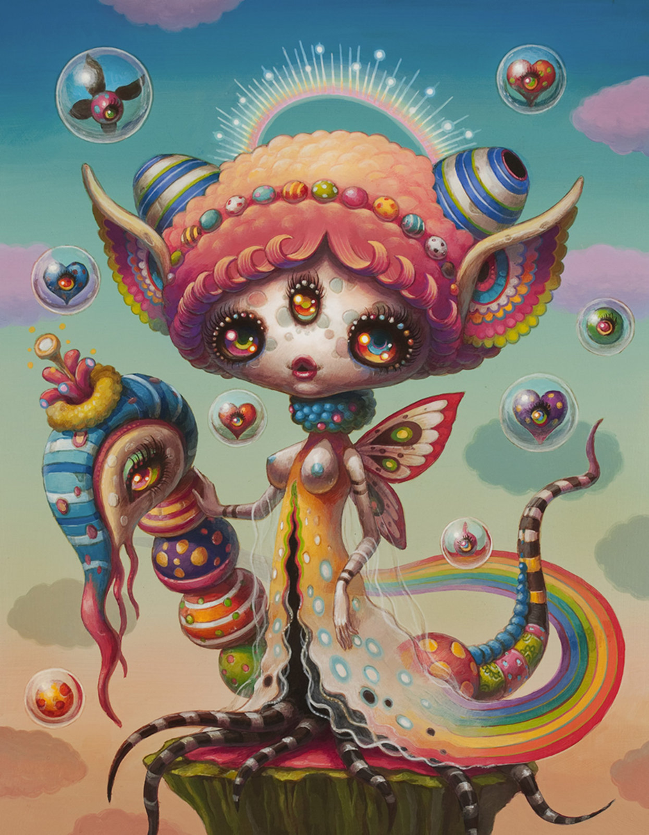 Безграничным просторам фантазии этой мастерицы остаётся только позавидовать. В голове Йоко помещается целая параллельная вселенная. Этот мир целиком состоит из карамели, сахарной ваты и флюоресцентной пластмассы. А населён он до приторности милыми обитателями. На что похожи эти существа? Может, на глюк, может, на инопланетяшку, решать вам. А на деле эти чудики олицетворяют собой нечто вроде результата эксперимента по скрещиванию мультяшки, огромного насекомыша и радушного монстрика. И все это «заправляется» индийскими мотивами. Интересно, правда? При первом же взгляде на эти очаровательные картины разум мутится от избыточной доз