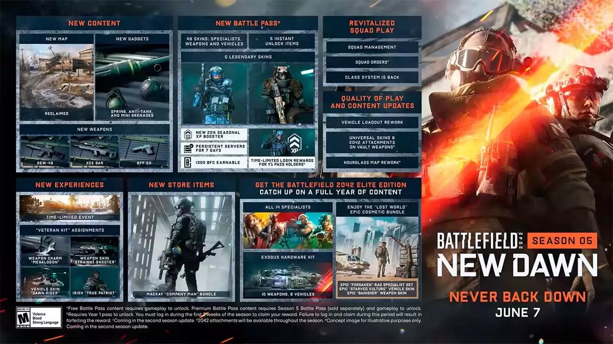 Студия DICE продолжает активную поддержку онлайн шутера Battlefield 2024, анонсировав бесплатное дополнение "Новый рассвет". Разработчики обещают новую карту, оружие, боевой пропуск и скины. Карта "Возвращение" отправит игроков в сеттинг зимней Чехии, сражения проходят на открытой местности и прямо внутри гигантских производственных помещений. Добавят новое оружие: BFP. 50, XCE BAR и GEW-56. Появятся полезные гаджеты, мини-гранаты и противотанковое вооружение. В свежем сезоне боевого пропуска будет 49 скинов, 5 разблокируемых предметов и другие подарки. Дополнительно в рамках пятого сезона "New Dawn" улучшат игру в отрядах, переделают карту Hourglass и систему выбора транспорта. Релиз патча запланирован на 7 июня 2023 года. Новость на сайте: https://topinator.ru/796-dlja-battlefield-2024-gotovjat-obnovlenie-novyj-rassvet-s-kartoj-vozvraschenie.html