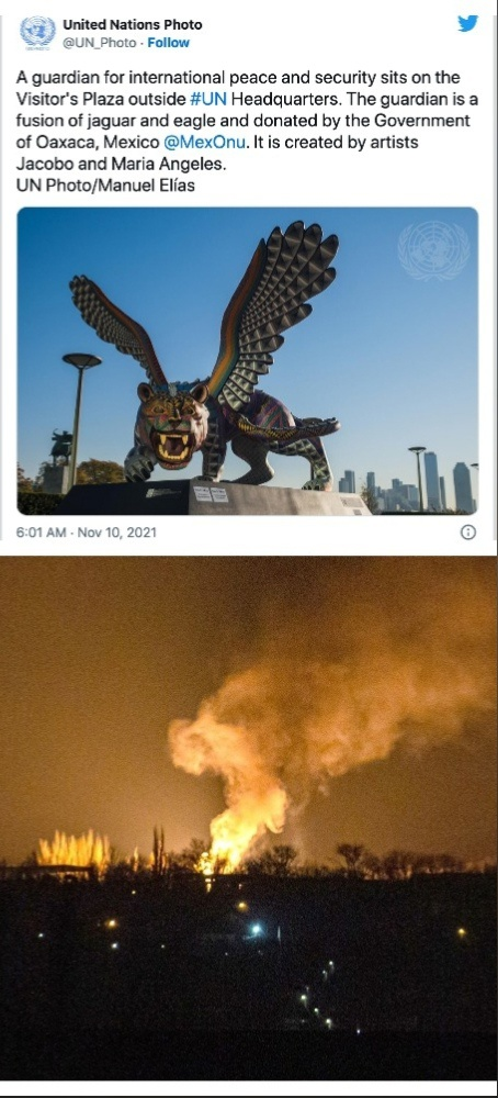 Наглядно о том, как глобалисты чрез ООН ритуально запрограммировали бойню славян и не только с целью недопущения контр-революции и воцарения антихриста Z. Надпись гласит на фотографии следующее: "Хранитель международного мира и безопасности стоит на площади для посетителей у штаб-квартиры ООН. Хранитель представляет собой слияние ягуара и орла и подарен правительством Оахаки, Мексика. Он создан художниками Хакобо и Марией Анхелес". Что мы видим на самом деле: созданная каббалистами после окончания гекатомбы ("Второй мировой войны") глобалистская организация — "Организация Объединенных Наций" — напрямую за несколько месяцев до начала бойни на Украине заявила о готовящемся жертвоприношении посредством антихристовой скульптуры. Данная скульптура в виде барса с крыльями является отсылкой, как к сну пророка Даниила, так и к Откровению Апостола Иоанна Богослова... Напомню, что с каббалистической точки зрения существует прямая корреляция меж датами начала двух мировых войн и "СВО"
