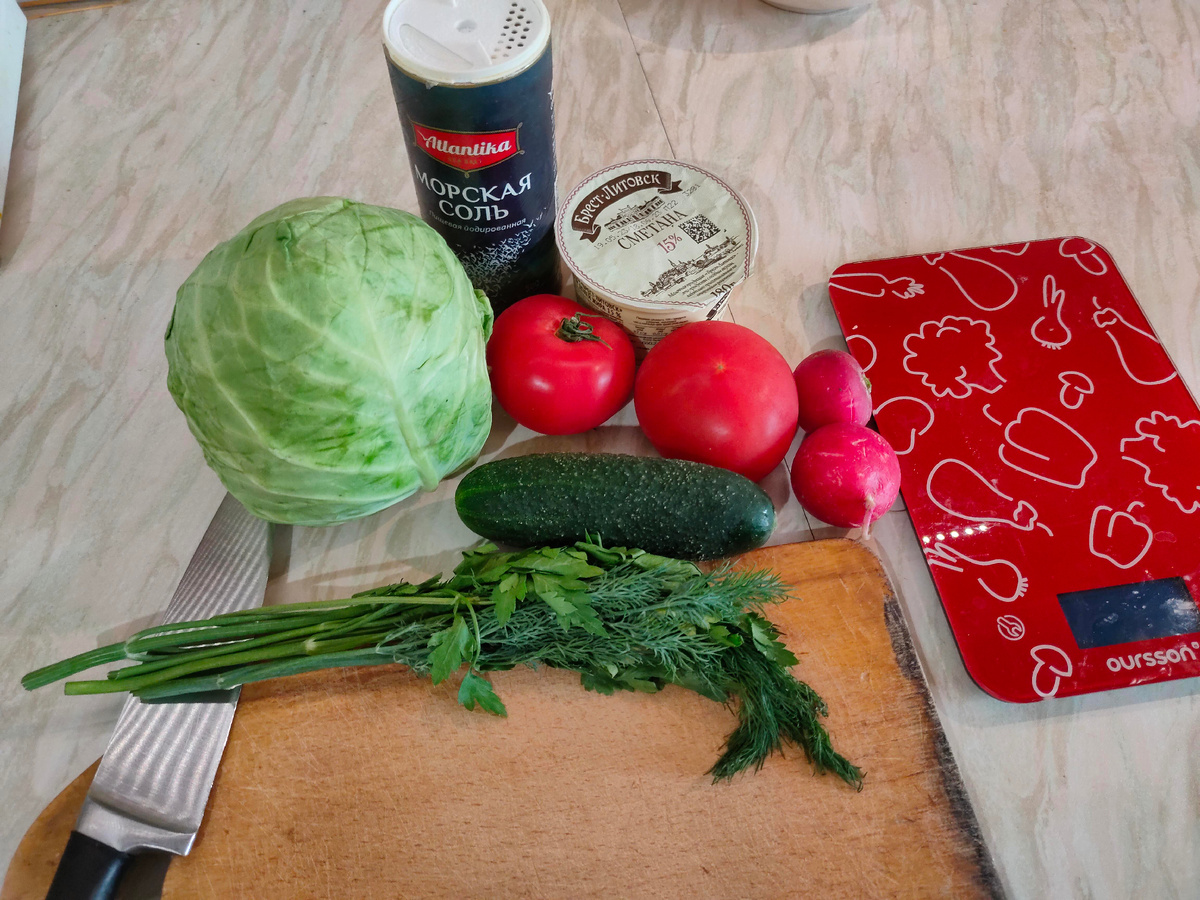 - 1 огурец - 2 помидора - 50 г редиса - 70 г капусты - 30 г зелени - 40 г сметаны - соль и перец по вкусу Шаг 1: Нарежьте огурцы, помидоры и редис кубиками. Шаг 2: Капусту нашинкуйте и добавьте к овощам. Шаг 3: Зелень мелко нарежьте и добавьте в салат. Шаг 4: Посолите и поперчите по вкусу и перемешайте. Шаг 5: Добавьте сметану и еще раз перемешайте. Готово!