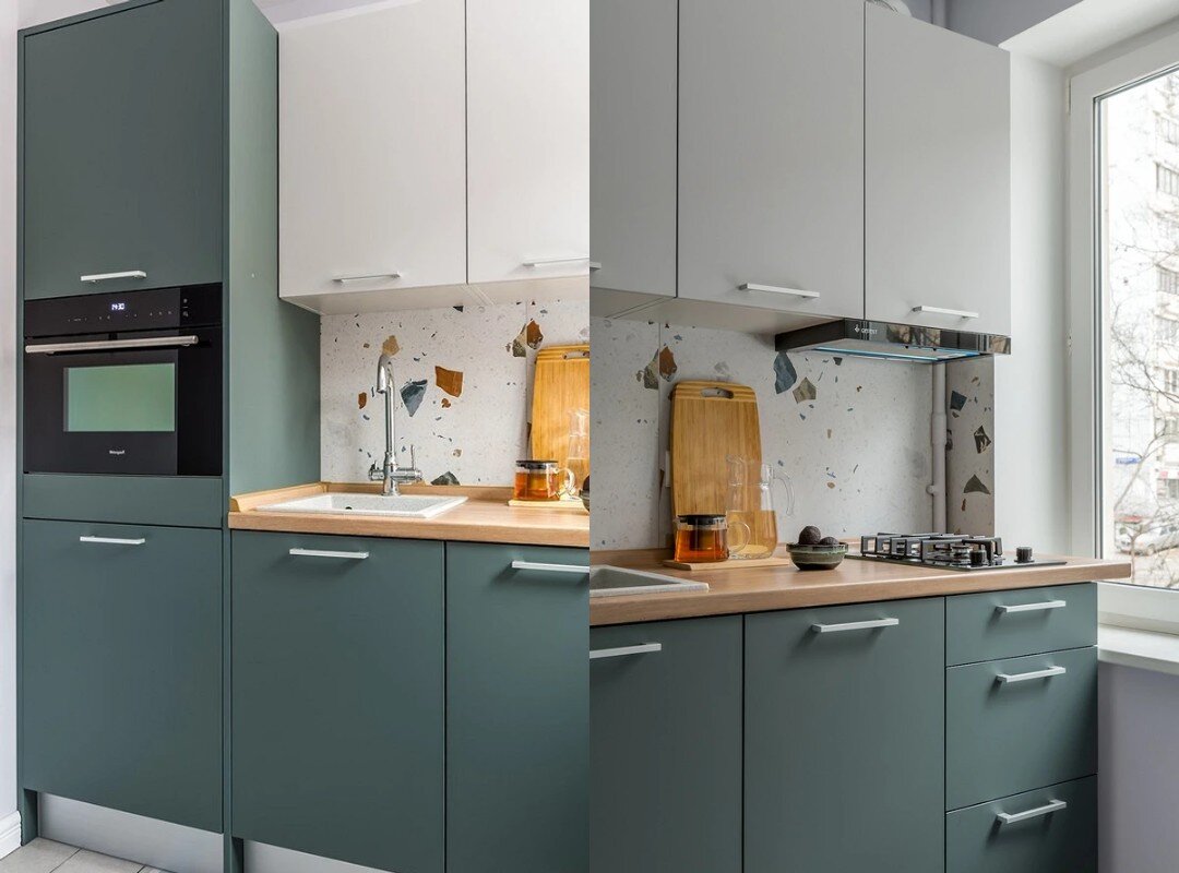 Обустройство кухни - одна из самых сложных задач. Особенно, когда места мало, как это часто бывает в типовых серийных домах. Я попросила дизайнера поделиться своим опытом, чтобы вам было проще оформить такое пространство у себя! Вот, что получилось. Сделать двухцветную кухню Важно, чтобы маленькая кухня не только была функциональной, но и эстетично выглядела, при этом не перегружая ограниченное пространство. Лидия предлагает использовать разные цвета для фасадов, чтобы сделать гарнитур более легким (например, светлые верхние и темные или цветные нижние - стандартная схема). "Такой подход позволит избежать монолитного вида гарнитура и создаст ощущение большего пространства, что особенно важно для небольших кухонь в типовых вторичных домах", - подчеркивает дизайнер. Выбрать акцентную плитку для фартука Визуальные акценты помогают отвлечь внимание от маленькой площади кухни, и это популярный прием, который используется дизайнером в ее проектах. В первом варианте используется геометрическа
