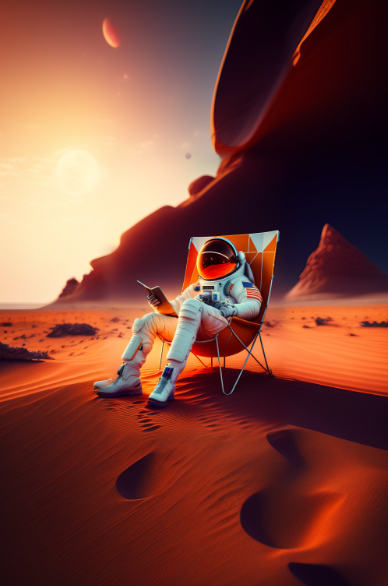 Жил-был астронавт по имени Алекс. Он мечтал об исследовании космоса и далеких планет с самого детства. И вот настал долгожданный день, когда Алекс отправился в свою самую захватывающую космическую миссию - путешествие на Марс. После многих месяцев путешествия и интенсивной работы на красной планете, Алекс решил взять небольшой отдых. Он развернул свой шезлонг на песчаной поверхности Марса, где не было ничего, кроме пустынных просторов и красивого заката. Алекс лежал на шезлонге, наслаждаясь миром вокруг него. Он смотрел на небо Марса, где яркие звезды мерцали, а две луны лениво плыли вдалеке. Он слушал тишину и ощущал, как красный песок ласкает его ноги. Вокруг Алекса было так спокойно и тихо, что он почувствовал, как его усталое тело расслабляется. Вдыхая свежий воздух Марса, он чувствовал себя свободным и полным внутреннего покоя. Наблюдая за красивыми марсианскими пейзажами, Алекс начал фантазировать о том, какие секреты и загадки еще скрывает эта таинственная планета. Он мечтал о т