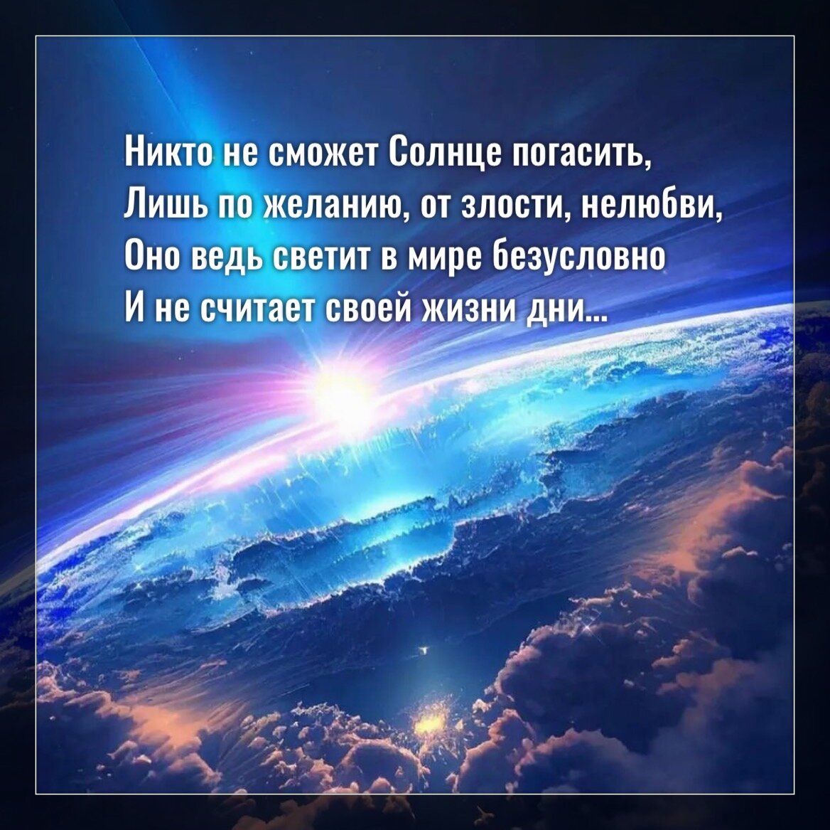 Никто не сможет Солнце погасить, Лишь по желанию, от злости, нелюбви, Оно ведь светит в мире безусловно И не считает своей жизни дни. Вы тоже принимайте всё спокойно, Уверенно программу выполняйте, Уроки все достойно проходите И друг на друга в жизни не пеняйте. Достаточно быть светлым человеком, Нести добро, не портить жизнь другим, Во благо принимать всё, что случится, Вы не песчинка, вы и есть весь мир! Раскрасьте его красками поярче, Пример почаще с солнышка берите, И больше положительных эмоций На эту Землю до конца несите!