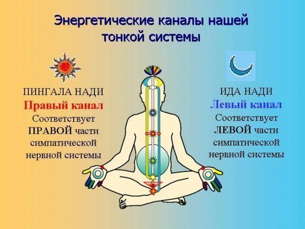 Одна из основных целей занятий йогой – управление внутренней энергией тела, ее использование для физического, умственного и духовного развития. Когда энергия течет по телу свободно и без препятствий, мы целостны, здоровы и энергичны, но если ее поток ослабевает или блокируется, мы начинаем болеть на ментальном и физическом уровне. Энергетические каналы в нашем теле называются нади, само слово происходит от санскритского корня «над» – движение. Физическое тело пронизано огромным количеством энергетических каналов, во многих источниках приводится информация, что их количество ограничено 72 000. В йогической практике используются в основном четырнадцать основных нади, важнейшими из которых считаются ида, пингала и сушумна. Главным каналом из этих трех, центральным, является сушумна, вдоль которого проходят каналы ида и пингала, перекрещиваясь между собой в нескольких местах. Ида нади начинается и заканчивается слева от сушумны, его еще называют «лунным каналом». Он прохладен и отвечает з