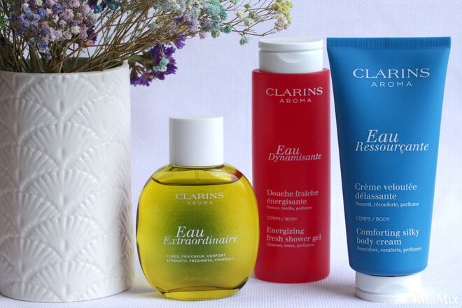 Сегодня расскажу о средствах для тела из линейки Clarins Aroma с тремя ароматическими композициями: Eau Extraordinaire, Eau Dynamisante и Eau Ressourcante.