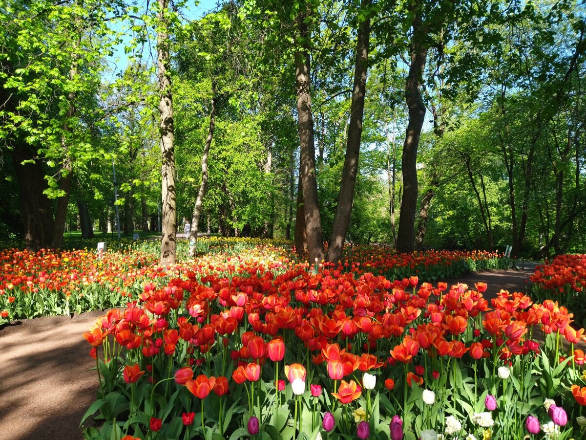Вот как там все выглядит сейчас: Впечатляет, бесспорно! С каждым годом экспозиция, как мне кажется, становится все более масштабной: К XI Фестивалю тюльпанов на Елагином высажено более 170 тысяч луковиц 50-ти различных сортов. И как бы некоторые ландшафтные снобы (типа меня☺) не морщили носы из-за банальных и иногда даже неоптимальных цветовых сочетаний, такое количество цветов - это все равно здорово! Но должна сказать, что в этом году есть несколько решений, которые кажутся мне заметно более удачными, чем в прошлые годы. Первое - это посадка смесей сортов: Пусть в этом месте посажены исключительно тюльпаны и не удалось сделать настолько идеально выверенное по тонам сочетание, как здесь: Или здесь: ... но смеси сортов в любом случае ближе к природе, чем посадки однотонными массивами! А некоторые комбинации в Елагином, на мой взгляд, просто удачны: В этом году дизайнеры экспериментировали с разными формами. Например, здесь сочетаются простые бокаловидные тюльпаны с лилиецветными в рамк
