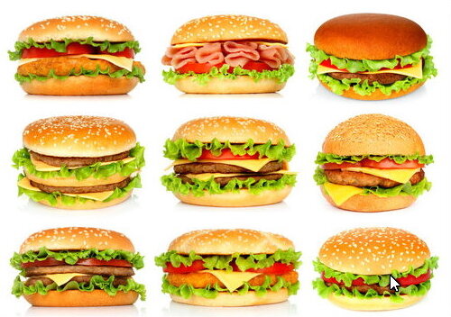 Существует множество разновидностей бургеров, которые отличаются как начинкой, так и способом приготовления. Основой любого бургера является жареное мясо, но в зависимости от рецепта оно может быть говяжьим, свинным, куриным или даже рыбным. Например Чизбургер— это гамбургер с сыром сверху котлеты, беконбургер с беконом,фишбургер с рыбой.
