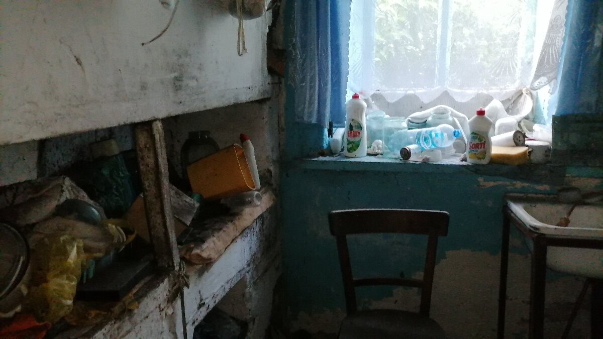Продолжаю дальше показывать заброшенный дом. Что мы там увидели. Осмотрим ванную комнату. Ванная комната достаточно огромная, в которой есть и печка, и окно и ванная. И даже раковина. Да и так места много. Рассмотрим всё по порядочку: Печка огромная. И совсем ещё в хорошем состоянии. Мне кажется если ее сейчас раскочегарить, то она вполне заработает. Есть окно. На окнах до сих пор висят шторы и тюль. Возле окна стоит стул. Напротив печки находится ванная. В ней стоят пластмассовые тазы. Видимо в них стирали белье. А также есть полочка, на которой стоит различная посуда. И лежат тряпки. Вода в дома была проведена, судя по дополнительным трубам. Над ванной была сделана деревянная полочка. На которой до сих пор стоят моющие средства для посуды и для уборки. А также пищевая сода. Скорее всего ею чистили посуду раньше. И ещё стояла посуда. В этом доме ее слишком много. Одна стена была покрашена, где стоит ванная. А другая стена оклеена обоями. Раковина железная, квадратная. Правильнее будет