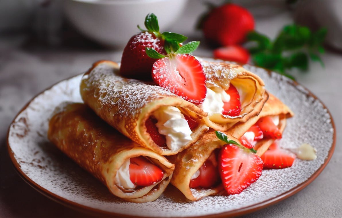 А вы знали, что клубника и земляника — это разные виды одного и того же растения? Научное название клубники — «Земляника ананасная», из-за сахаристого вкуса. Раньше эти две ягоды выглядели практически одинаково и отличались только вкусом. Клубнику, которую знаем, вывели относительно недавно (отбирали самые большие и сладкие клубни, пока не добились любимого всеми вкуса и нужного размера ягод). Сладость свежей ананасной клубники мы и используем для нашего сегодняшнего рецепта. Что понадобится? Для теста: · 250 мл молока; · 170 г пшеничной муки; · 1 яйцо; · 0,3 ч. л. соды; · 0,3 ч. л. соли; · 2 ст. л. клубники, перетертой с сахаром в пропорции 1:2 (или клубничный джем); · 1,5 ст. л. подсолнечного масла. Для начинки: · 150 г клубники; · сахар — по вкусу; · взбитые сливки — по вкусу; · 2 ст. л. сметаны. Как готовить? Шаг 1 Вылейте молоко в миску, добавьте яйцо, перетертую клубнику (или клубничный джем), соль и соду. Массу хорошо взбейте, добавьте муку и снова размешайте. Шаг 2 Влейте подс
