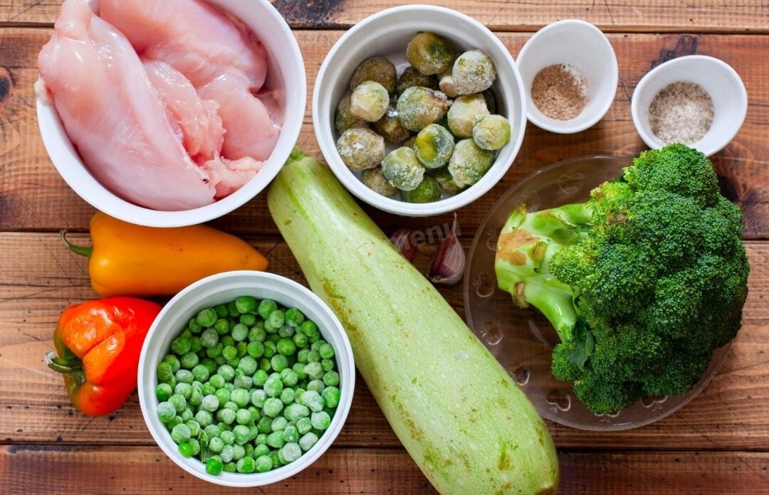 - Как сделать ПП курицу запеченную с овощами в духовке? Подготовьте указанные продукты. Овощи можно брать по своему вкусу, но не выбирайте картофель. Можно взять замороженные готовые овощные смеси. От курицы возьмите куриное филе, можно взять другое куриное мясо, но без кожи. Сухие специи можно взять набором, а можно добавить те, какие нравятся. Оливковое масло можно заменить другим растительным.