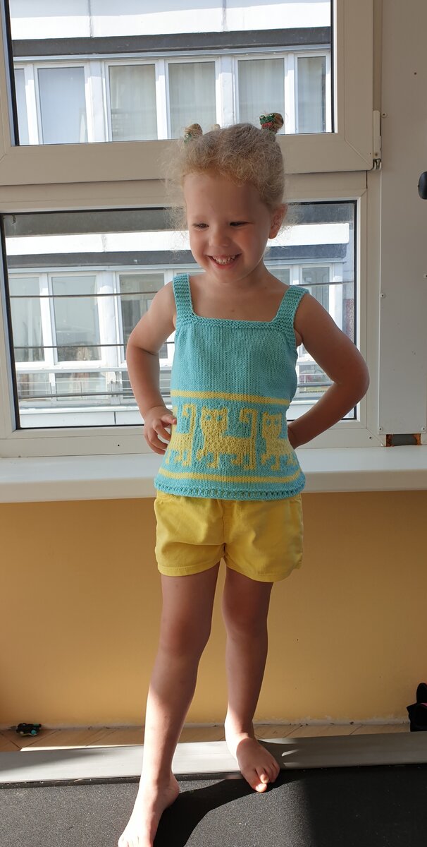 Маечку можно вязать с жаккардом, с вышивкой петля в петлю или просто маечку😃😍❤ Я связала на рост 100см и Объем груди 53см. Нитки Yarnart jeans 50гр/160м. Спицы 3,5 для основного полотна и 4 для жаккарда. Длина изделия 36см, ширина 27см. Вес 70гр. Первое что мы делаем-конечно же вяжем образец. И в этот раз вязать их нужно два-один лицевой гладью, второй жаккард. Рисунок здесь👇 Как вязать жаккард здесь👇 Скорее всего плотность не совпадет, тогда на жаккард берем спицы побольше. Я взяла на 0,5 размера больше, но полотно в месте жаккарда немного стянуло, можно было брать на размер больше. Моя плотность вязания 2,4 петли/3,2 ряда. Объем груди умножаем на плотность в петлях (53×2,4=127,2). Моя маечка с жаккардом, значит смотрим сколько петель нужно на раппорт рисунка. В раппорте 22 петли. 127÷22=5,7р. Догоняем до шести 22×6=132петли. Значит набирать буду 132 петли плюс одна петля для замыкания в круг. Низ моей майки оформлен ажурной полосой👇 Можно и без неё, можно несколько рядов пла
