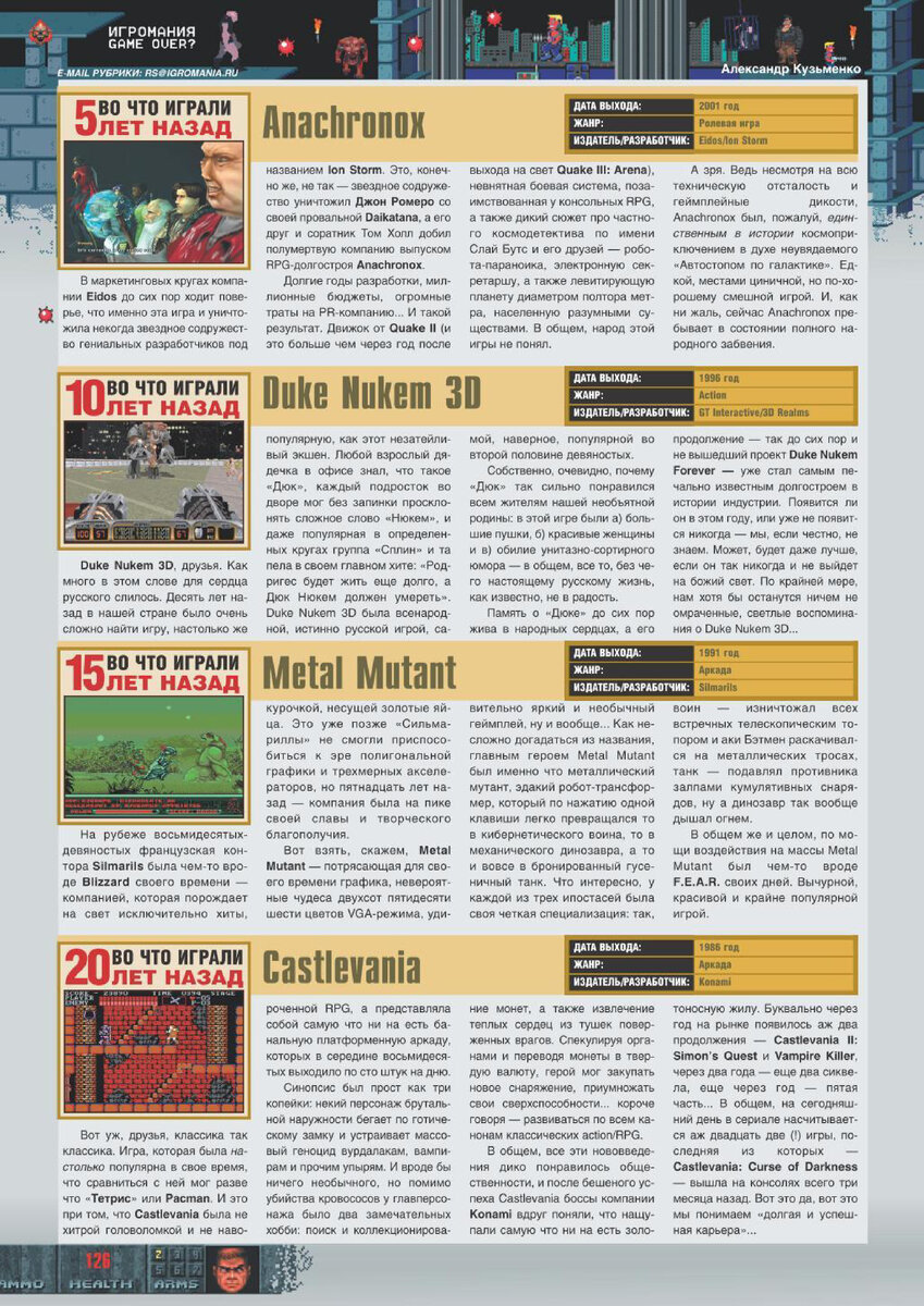 Что писали в Игромании об Anachronox, Duke Nuken 3D, Metal Mutant и Castelvania через (уже тогда) много лет с их выхода? Продолжаем рубрику «История в квадрате». Ваши подписки и комментарии согреют меня пуще всех свечей монастырских 🌟 Пишите, что любо вам, а что нет в заметках сих, поправляйте ошибки досадные да предлагайте идеи смелые. Будем сочиняти повесть игровых лет вместе 🙏 А еще подписываетесь на канал Летописца в Telegram, где старец разыгрывает игровую классику и прочие призы славные, ценные 🙀
