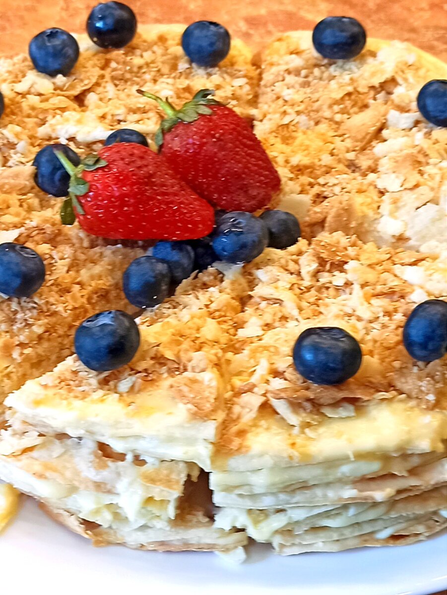 Домашний вариант вкусного торта. Тесто буду готовить, не классическое слоёное, но тоже слоистое и хрустящее. Рецепт теста: 200 г маргарина 200 г сметаны 20% жирности 2 стакана муки Маргарин перетераем с мукой, добавляем сметану. Замешиваем тесто, делим на 6 - 7 частей и отправляем в морозильную камеру на 30 минут. Тесто тонко раскатываем и выпекаем при 180° до лёгкого золотистого цвета. Обрезаем коржи задуманной формы. Обрезь оставляем на обсыпку. Крем: 200 г сливочного масла 200 г сгущёнки хорошей, не жидкой 1 ложка коньяка , по желанию Мягкое масло взбиваем до пышной белой массы и вводим частями сгущёнку, не переставая взбивать. Промазываем коржи кремом, ставим лёгкий груз, можно просто положить деревянную кухонную доску примерно на 5 часов. Убираем груз, наносим крем и обсыпку на верхний корж. Убираем в холодильник. Торт хранится в холодильнике достаточного долго, не теряя вкуса. Но украшать ягодами тогда нужно при подаче. Отрезаем и наслаждаемся!