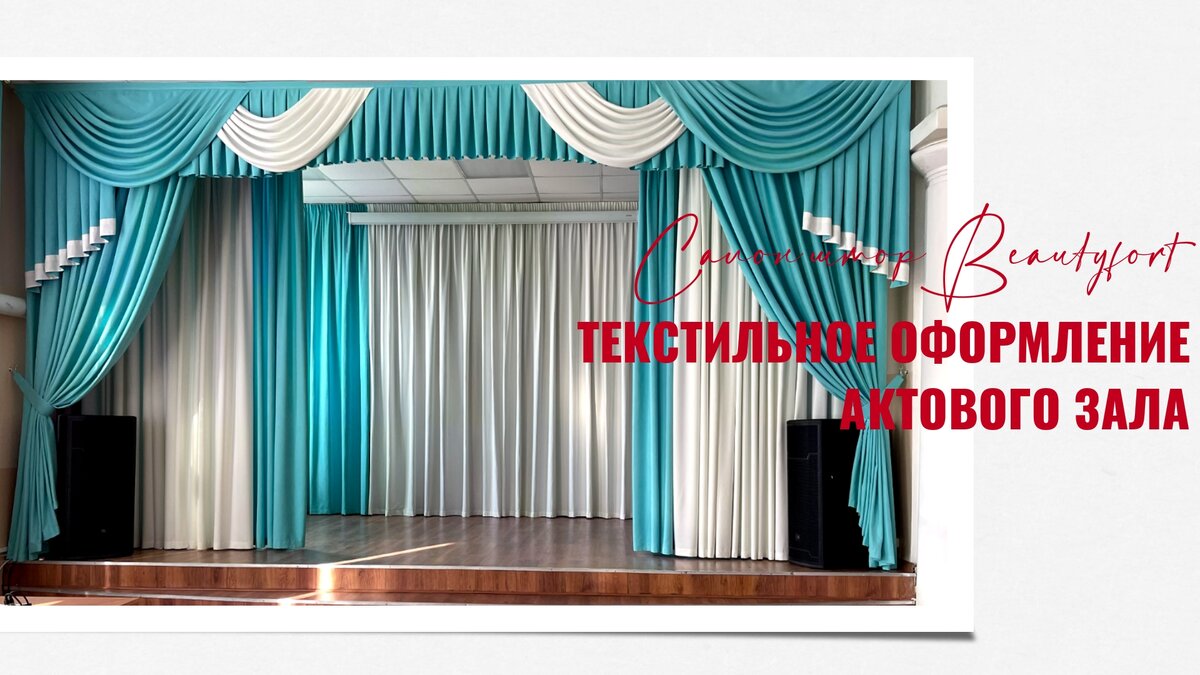 Дорогие друзья! В сегодняшнем посте хочу поделиться с Вами замечательными эмоциями от выполненного проекта в городе Жуковский, над которым трудился весь наш коллектив салона штор Beautyfort (Бьютифорт) на протяжении целого месяца. Объектом работы был школьный актовый зал, в котором нужно было заменить портьерное убранство сцены и украсить ламбрекенами четыре окна зала на высоте 3,7 м. Задача, которая стояла перед дизайнером: сделать помещение более светлым, нарядным и торжественным. Работу мы начали с замера сцены и оконных проемов, обсудили цветовые предпочтения, просмотрели ряд готовых решений, обсудили, на основании внесенных предложений был разработан собственный эскиз. После просчетов расхода ткани и материалов началась работа по созданию технических заданий для пошива, нужно было учесть множество нюансов, а именно: способы крепления штор и ламбрекенов к карнизам исходя уже из имеющихся в зале, техническую взаимосвязь деталей между собой, варианты подхватов для прямых полотен исхо