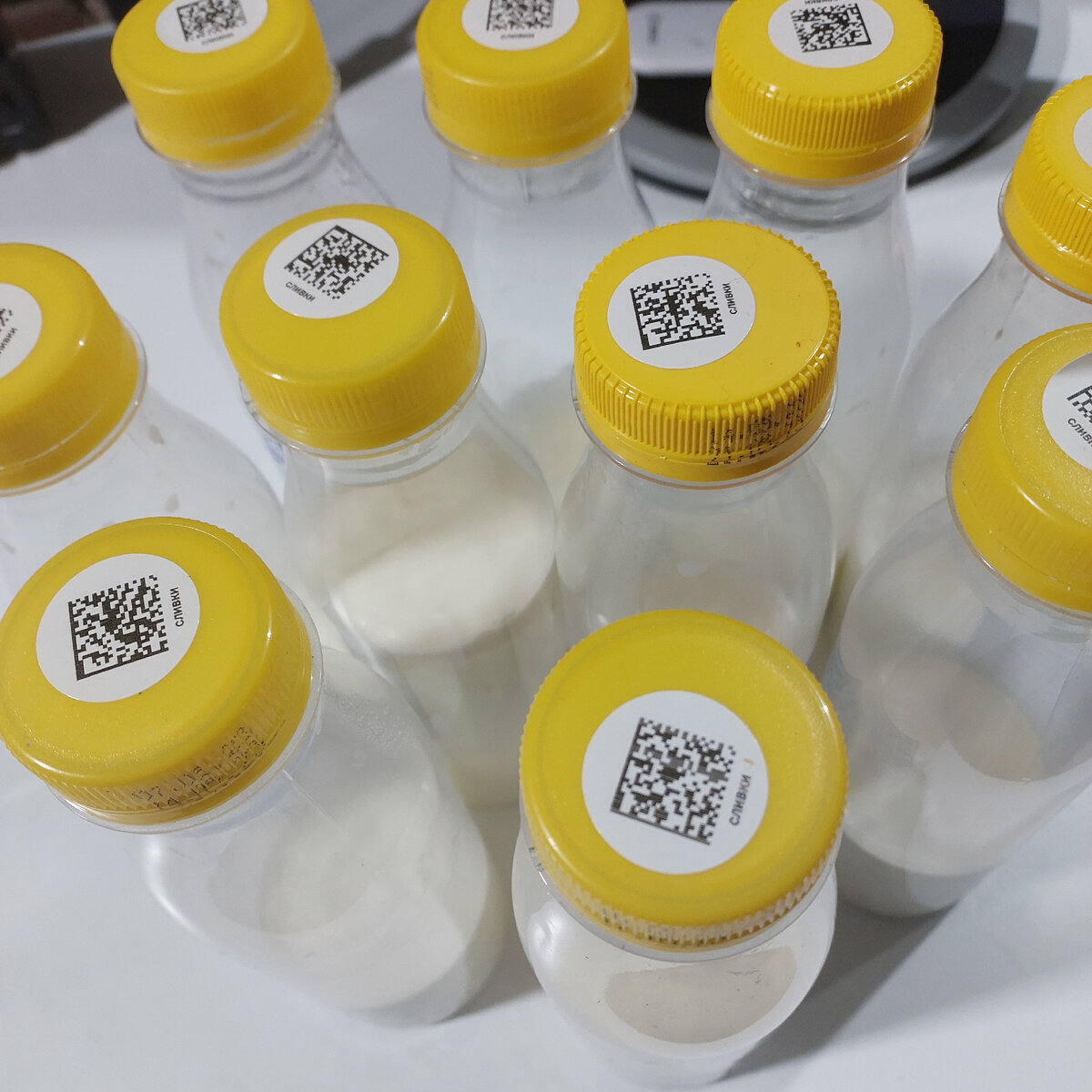 Сыр этот мы называем Мусыр. Так как он стопудово настоящий, изготовлен из настоящих 10% сливок, которые покупаем для Олежика. Ну а сливки, это производное от коровьего молока, а коровы говорят Му. А кроме этого, название это звучало в одной из сценок "Уральсикх пельменей")) Красота спасает мир, а голодных сыр - Мусыр Когда Олежик был маленький и по возрасту и по размеру, я всё время искал чем его подкормить. Родившись с весом всего в 1 килограмм, он конечно всегда сильно отставал от сверстников. В ход шли и растишки и малоежки, дорого получаось, но эффект был малозаметен. Однажды я взял ему бутылку сливок. Он выпил, понравилось. Начал покупать каждый день. И Олежек начал и подростать о обрастать. Даже жирок появился, венок практически не видно стало. Конечно не каждый день он всю бутылку выпивает. Я не неволю, не заставляю. Вот они и копятся в холодильнике Это малая часть)) Как насобриается, примерно, литра 2-3, сливаем в кастрюльку. Кастрюлю лучше с антипригарным покрытием, так как ки