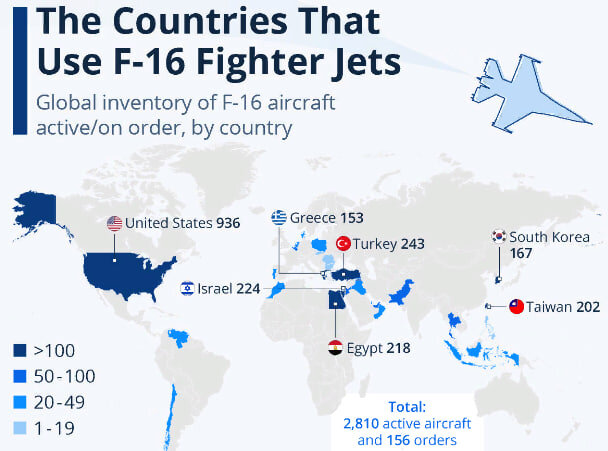 Взято из "Вместо блумберга". Сейчас военная тематика крутится вокруг поставок F-16 Украине. А сколько таких истребителей имеют разные страны? Как выяснилось: США - 936 действующих самолетов, Турция - 243, Израиль - 224, Египет - 218, Южная Корея -167, Греция - 153, Тайвань 136, Бельгия - 52, Польша - 48, Дания - 43 и Нидерланды - 29. Хоть данные и представлены по действующим F-16,но сколько из них действительно могут выполнять боевые задачи - неизвестно.