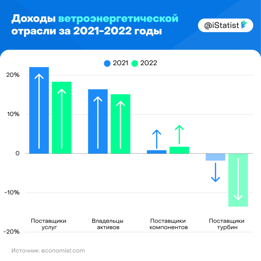 Страны уделяют особое внимание возобновляемым источникам энергии. Количество заказов на ветряные турбины растут. Однако светлое будущее для индустрии выглядит очень сомнительным. Четыре крупнейших западных производителя ветряных турбин – Ge Renewable Energy, Nordex, Siemens Gamesa и Vestas – занимают около 90% рынка за пределами Китая. В 2022 году они получили совокупный доход в размере 42 млрд евро ($46 млрд). Но в то время как операторы ветряных электростанций извлекли значительную выгоду из высоких тарифов на электроэнергию, производители турбин ушли в минус, а их поставщики едва зарабатывали смогли оплатить расходы. В прошлом году «большая четверка» понесла чистые убытки в размере почти 5 млрд евро. А недавно Ge Renewable Energy, Nordex и Siemens Gamesa сообщили о новых убытках за первый квартал этого года. Несмотря на то, что Vestas, крупнейшая из конкурентов, получила небольшую чистую прибыль в размере 16 млн евро при продажах в 2,8 млрд евро, ее исполнительный директор Хенрик Ан