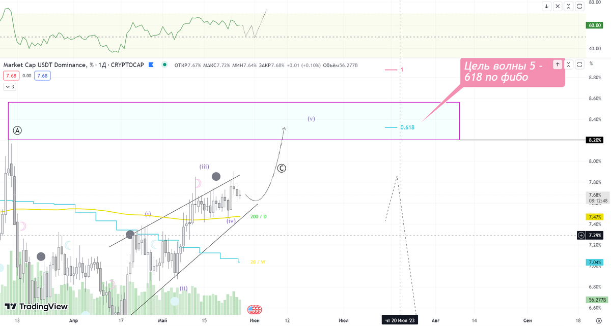 На Tether мы видим 5-ти волновую структуру с потенциалом обновления high . Сейчас мы находимся в плоской коррекции в рамках волны 4. Рост стоит ждать в течении 7-ми дней , открытие новой недели и плюсом полнолуние через неделю ровно. Можем увидеть ложный вынос , опять же для того чтобы разгрузить осциллятор RSI в медиану.