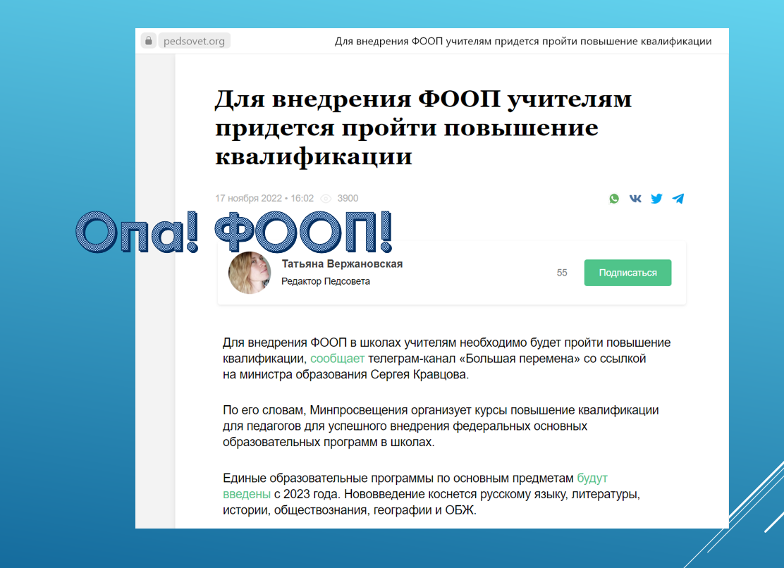 Уже несколько дней «крутятся» в голове перефразированные слова из песни про принцев, которых мало, поэтому на всех их не хватает. Причина проста, как три копейки: с 1 сентября школы страны переходят на обучение по единым ФООПам (федеральным основным общеобразовательным программам) по ряду предметов, а значит, педагогам надо пройти обучение по работе с новыми программами. Ну, учиться нам не привыкать, но только где и чему? Оказалось, что бесплатных программ в институтах развития образования/академиях повышения квалификации крайне мало, поэтому попасть на них практически невозможно, а школьная администрация грозится отстранить от работы тех, кто не предоставит «корочку» о повышении квалификации по ФООПам. Думаете, о внедрении ФООПов Минпрос не предупредил, и поэтому никто ничего заранее не знал? А если знали, то почему не открыли необходимое количество курсов в учреждениях, прямая обязанность которых – организация обучения педагогов? Неужели не сумели сложить количество филологов с матем