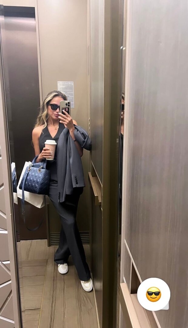 Спортсменка просто шикарно выглядит. У неё строгий серый костюм, состоящий из жилетки, пиджака и брюк. Алина предпочла надеть белые кроссовки, чтобы было удобнее. Также фигуристка подчеркнула образ небольшой сумкой тёмного синего цвета и эффектными милыми аксессуарами.