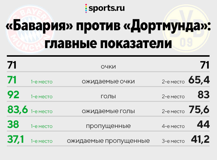 Это все качественные показатели. Не стоит кидаться владением мячом, интенсивностью прессинга (PPDA), пасами в чужую штрафную, где «Бавария» тоже лидирует – это показатели стиля игры. Можно много владеть мячом, но мало создавать. Важнее, что «Бавария» создавала, забивала, допускала меньше «Дортмунда».