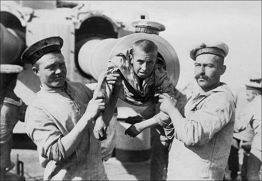 Но всё же, на мой взгляд, это юнга из ствола торчит. Во-первых, он по всем параметрам заметно меньше держащих его дюжих сослуживцев, во-вторых, исходя из надписей на ленточках бескозырок, это происходит на линкоре "Андрей Первозванный",