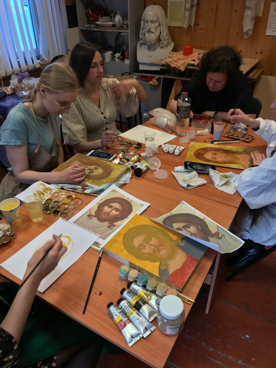 Мы с ними продолжаем писать оплечную некрупную икону Спасителя, разбираясь во всём-всём. С наступлением тёплых погод вышли на улицу - ставим стол перед входом в иконописную школу, смотрите, как у нас тут замечательно ) Вид от нас в строну храмовых ворот - с птицами в ветвях, абрикосовыми и вишнёвыми старыми деревьями, мягким вечерним светом. А если обойти здание школы, то открывается вид на ирисы - совершенно волшебные цветы - и на апсиды нашего храма. Ну как не писать счастливо в таком окружении. Вот так и учимся - с разной скоростью, с большим желанием освоить технологию, с вниманием и сосредоточенностью. Спаситель смотрит на нас, мы смотрим на Него. Индивидуальные особенности видны у каждого, это нормально. Менее нормально - уделять им максимум внимания и стараться, мм, самовыразицо. Студенты наши вполне себе хорошо понимают главную задачу - научиться классике, научиться рисовать с такой степенью свободы, которая изгоняет страх. Скоро конец учебного года (хотя - не очень-то и