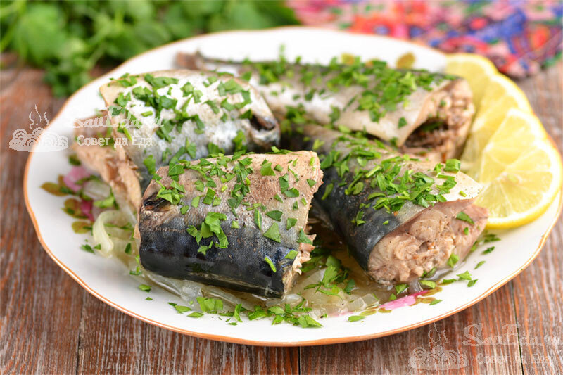7. На другую тарелку выкладываем весь лук из кастрюли, сверху размещаем куски скумбрии. Поливаем соком лимона, небольшим количеством масла (можно и без него), посыпаем перцем, мелко нарезанной петрушкой и подаем на стол с гарниром. Рыба получается сочной, за счет специй и лука ароматной и вкусной.