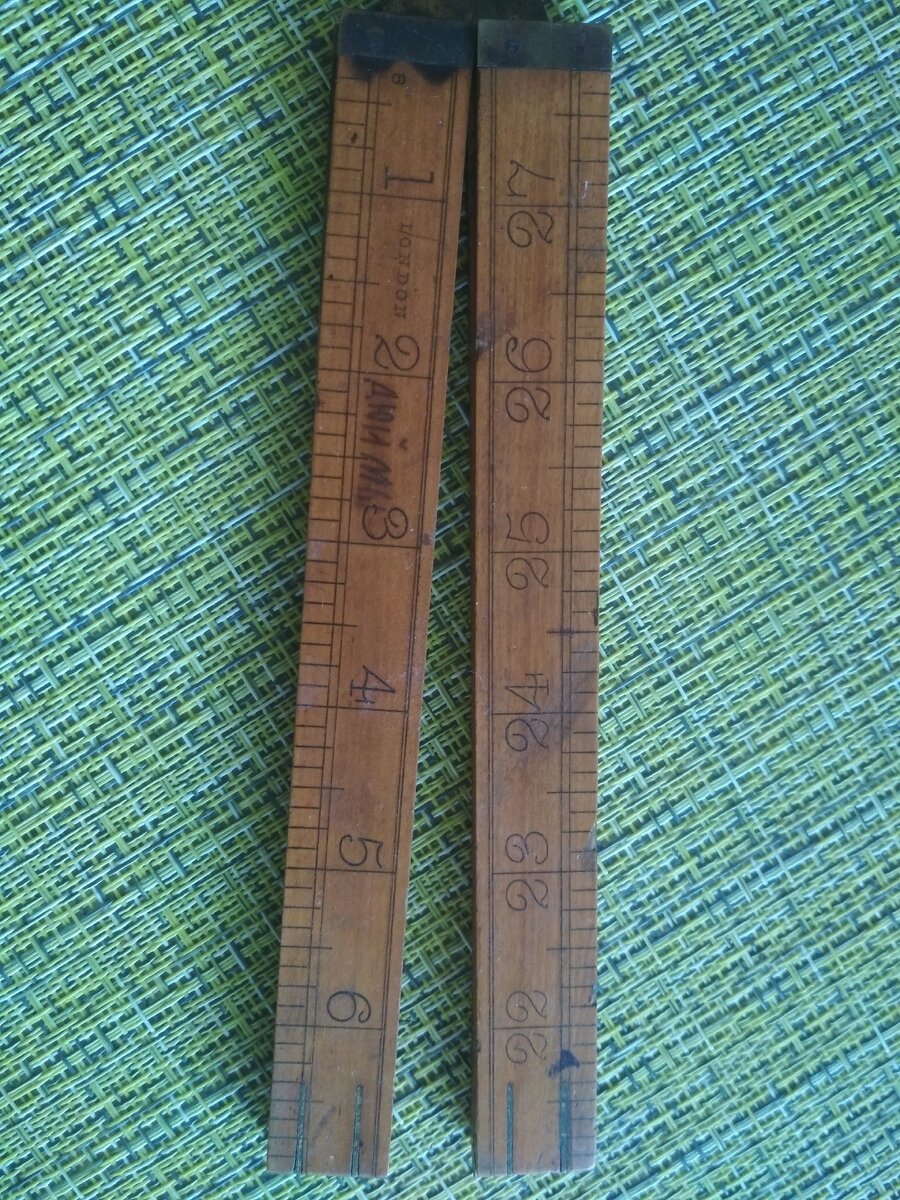Лет этому точному по размерам и разметкам инструменту около двухсот. Изготовлен в Лондоне. Деревянный, с металлическими деталями, позволяющими сложить метр в четыре раза.