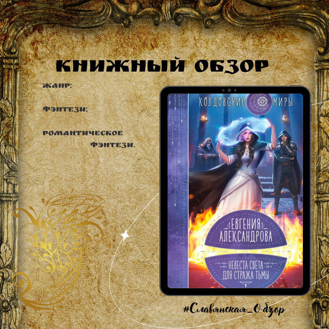 "Невеста света для стража тьмы" Автор: Евгения Александрова Объём: 416 стр. Ценз: 16 + Вполне себе цепляющее начало, во время которого я подумала, что героиня влетела в приключения прям со всего размаха. Подробнее в разделе сюжет. Книга читалась легко, слог автора мне уже знаком по циклу о Проклятом капитане, поэтому я особенно не раздумывала, когда увидела эту книгу. Хочу и всё тут. Тема спасения от тьмы/зла не нова, но в данном случае имеется изюминка, поэтому я сейчас об этом, собственно, заикнулась. Слабо пропустить через себя эту самую тьму? А вот герою нет. Сюжет Как только я открыла книгу и погрузилась в чтение, то сразу стала потирать ручки, ведь невеста то ненастоящая. Читатели видят первую сцену с точки зрения героини, поэтому становится понятно, что она вляпалась конкретно. Хотела подруге помочь, а в итоге оказалась в эпицентре назревающей катастрофы среди этих самых тёмных стражей. Так ещё и призрак с вредным характером крутится неподалеку. Короче, получила полный бук