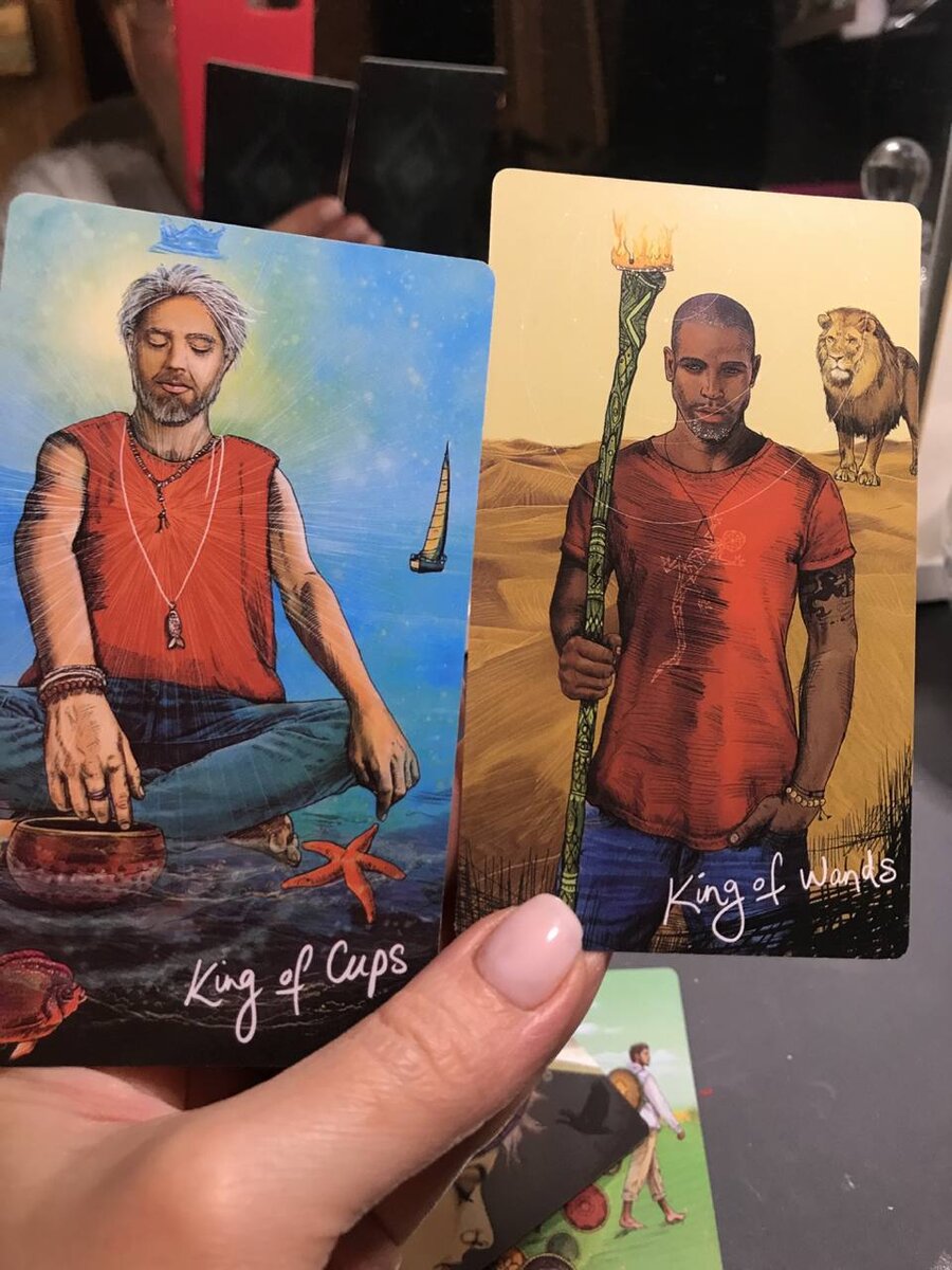 Сегодня расскажу про две карты из колоды Таро. Перед вами два младших аркана - Король Чаш (слева) и Король Жезлов (справа). При взгляде на эти картинки кажется, что это два человека из совершенно разных областей - слева некий умиротворенный медитирующий мужик средних лет, справа - брутальный пастух львов, что же между ними может быть общего? ))) Однако, оба они относятся к так называемому ресурсу «любви». Только Король чаш - это больше про чувства, романтику, заботу, умиротворение, а Король Жезлов - эмоции, физиология, страстный секс. Карты этой колоды обладают «говорящими» живописными картинками, в то время как в классической колоде Таро довольно сложно распознать именно эти значения, не зная их. Здесь же мы можем подключать свою фантазию и все, даже малейшие детали на рисунке имеют большое значение, ещё сильнее раскрывая направление нашей ассоциативной цепочки. Жезлы - это стихия огня (мы видим на карте факел), это стремительность, молодость, скорость, креативность, брутально