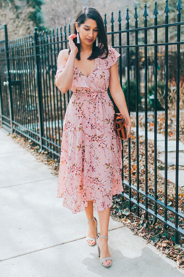 Шифоновое платье прекрасно сочетается с такими деталями, как рукава-фонарики, банты, завязки. Компактный аксессуар и лаконичные босоножки ничуть не перегружают образ.