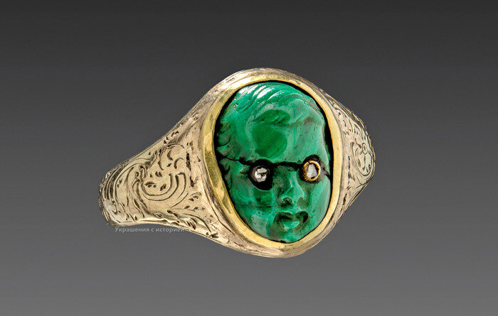В Кливлендском музее хранится необычное кольцо. Про него абсолютно ничего не известно, кроме способа, которым оно попало в экспозицию. Его вместе с другими предметами передала в дар семья Уэйдов, кливлендских меценатов, в 1916 году. Кольцо изготовлено из золота с красивой гравировкой из цветочных мотивов. Вставка вырезана из малахита и изображает лицо ребёнка, глаза выполнены из алмазной крошки. Чёрное вокруг глаз – не очки, а, скорее всего, следы вещества, которым закрепили алмазы. Через глаза и переносицу идёт трещина, очевидно, камень раскололся от старости и внутреннего напряжения. Датируется кольцо примерно 1870 годом. В то время было модно носить траурные украшения с изображениями усопших. Однако цвет вставки слишком яркий для подобного рода предметов. Но оно всё-таки может быть траурным. Как известно, малахит называют «камнем трансформации», потому что он помогает успокаиваться и исцеляет эмоциональную боль, впитывая её в себя. Возможно, умер ребенок, и это кольцо должно было по