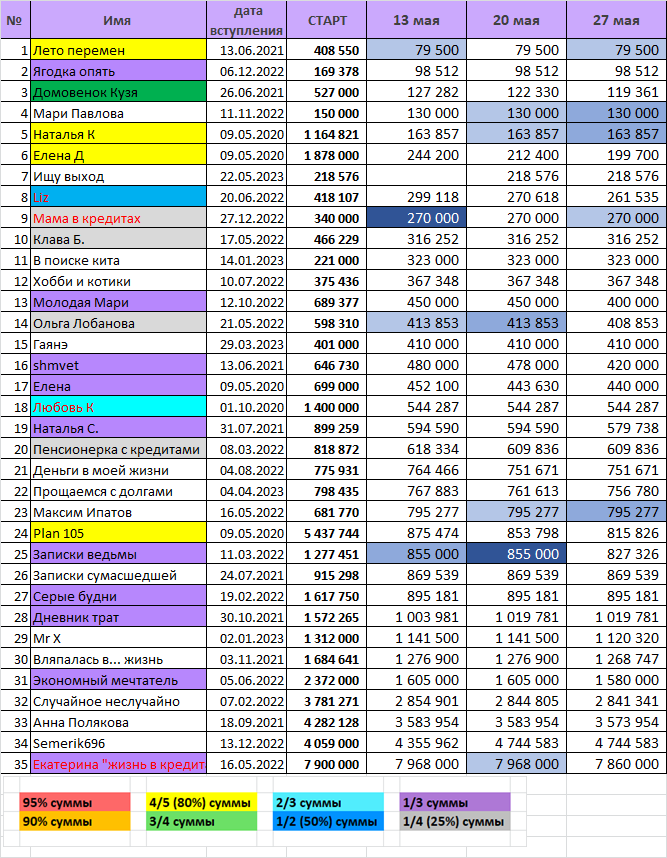 Всем привет! Результаты этой недели порадовали. Были большие погашения, относительно мало прогульщиков, и реабилитировалась участница Записки ведьмы, которая вот-вот была на пороге исключения из Марафона. Эх, не будет в этот раз у нас новичка. Не в этот раз... Ну что ж, показываю вам сводную таблицу: А вот и наши пьедесталы. Кто же сегодня погасил самые большие суммы? Сегодня в лидерах Екатерина "жизнь в кредитах" (минус 108000р), shmvet (минус 58000р) и Молодая Мари (минус 50000р). Поздравляем! Так как у всех разные размеры задолженности, справедливо отмечать погашение не только в рублях, но и в процентах по отношению к предыдущей сумме долга: И сегодня на первом месте shmvet, снизившая долг на 12,13%. На втором месте - Молодая Мари - минус 11,11%. Елена Д. погасила 5,98% от долга, и этого хватило, чтобы попасть в призовую тройку. Поздравляем! Что интересно, Екатерина "жизнь в кредитах", погасившая самую большую сумму на этой неделе, не попала в первую тройку по погашению в процентах,