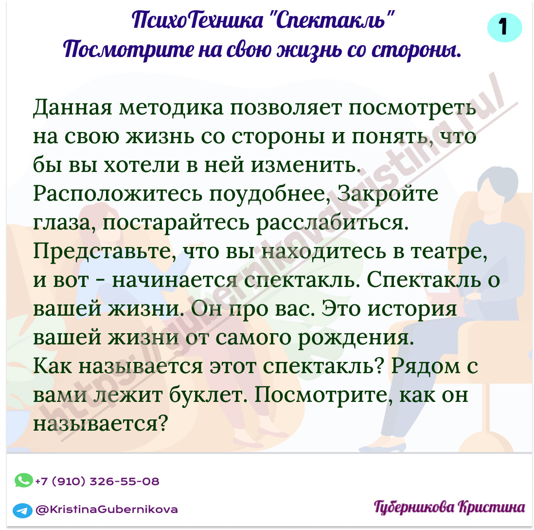 Вижу по просмотрам, что видео версия техники "Спектакль" очень вам понравилась! Это замечательно! Специально для тех, у кого нет возможности смотреть видео, ниже предлагаю текстовый вариант! Забирайте себе и делитесь с теми, кому будет полезно! С теплом к Вам!