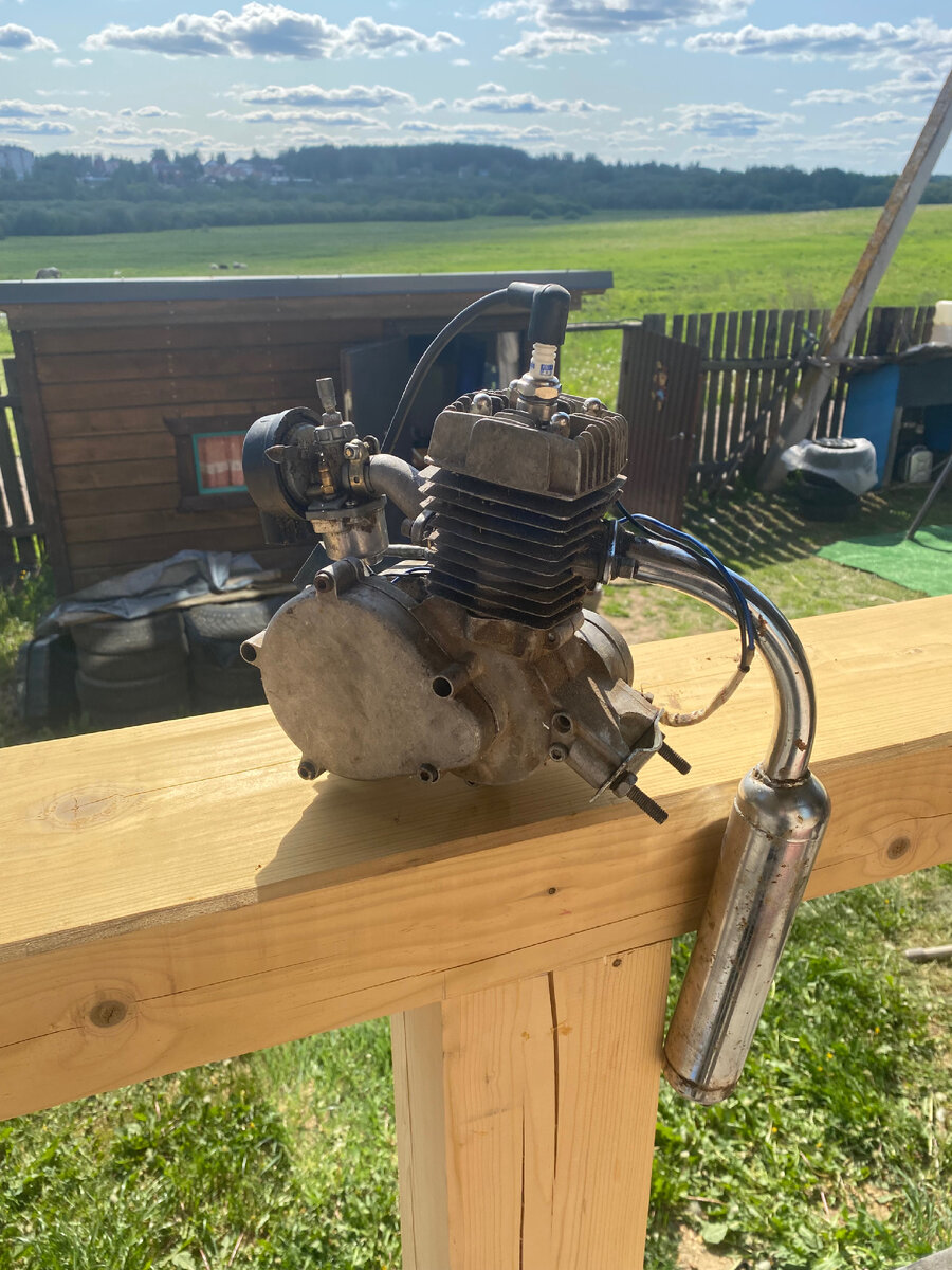 Всем привет! Сегодня начал проект и работу над мотором от велосипеда. Честно говоря я думал что на нём умер генератор для свечи зажигания, но оказалось что дело было в том что лопнуло кольцо на поршне которое я в ближайшее время буду покупать. Ещё мне нужно будет разобрать полностью мотор и очистить его от ржавчины и всех переработок масла которое я в прошлом случайно перемешал с бензином в больших пропорциях чем нужно было. Нужно будет ещё купить свечу зажигания, а то эта слишком длинная, что даже бьётся об поршень если закрутить до конца. В планах у меня сделать из него мини цикл. А возможно и трицикл, я ещё не определился. Впрочем флаг мне в руки и в перёд.